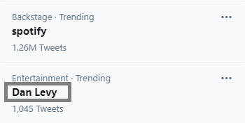 The next day, Sunday Feb 28, “Dan Levy” trended with 1,045 Tweets, mostly discussing his outfit at an awards show.