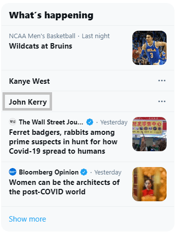 In the middle term, “John Kerry” for example, people on Twitter are referring to John Kerry talking about how “Earth only has 9 years to avert the worst consequences of the climate crisis.” As a result, his name is trending. This is what should be done and is the goal for Rep. Grace Meng’s H J Res 23 bill when it is voted on, as well as the hashtag #16ToVote. (An important thing to note is that stats for a trend don’t always show up, like how many posts are making it trend. Sometimes, this information does show up, like in the examples below. Other times, it shows up later, like in an hour or two.)